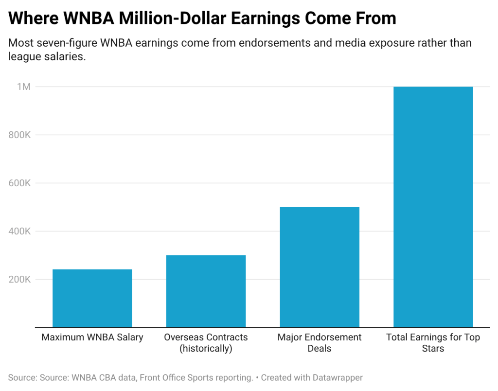 Unlike many men’s professional leagues, seven-figure income in the WNBA rarely comes from salary alone.